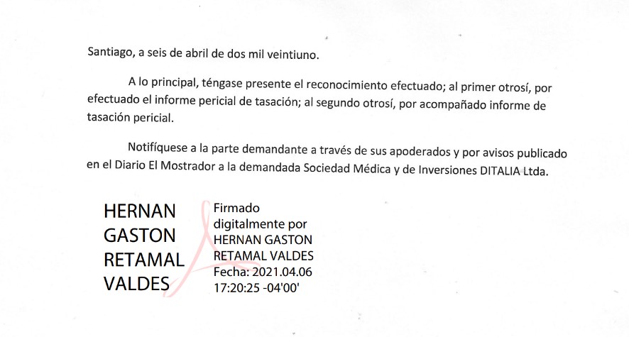 NOTIFICACIÓN A LA PARTE DEMANDANTE A TRAVÉS DE SUS APODERADOS Y POR AVISOS A LA DEMANDADA SOCIEDAD MÉDICA Y DE INVERSIONES DITALIA LTDA