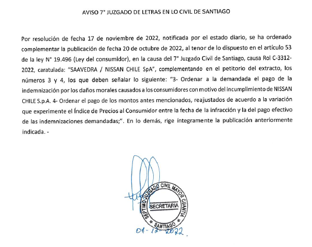 AVISO 7° JUZGADO DE LETRAS EN LO CIVIL DE SANTIAGO "SAAVEDRA/NISSAN SPA"
