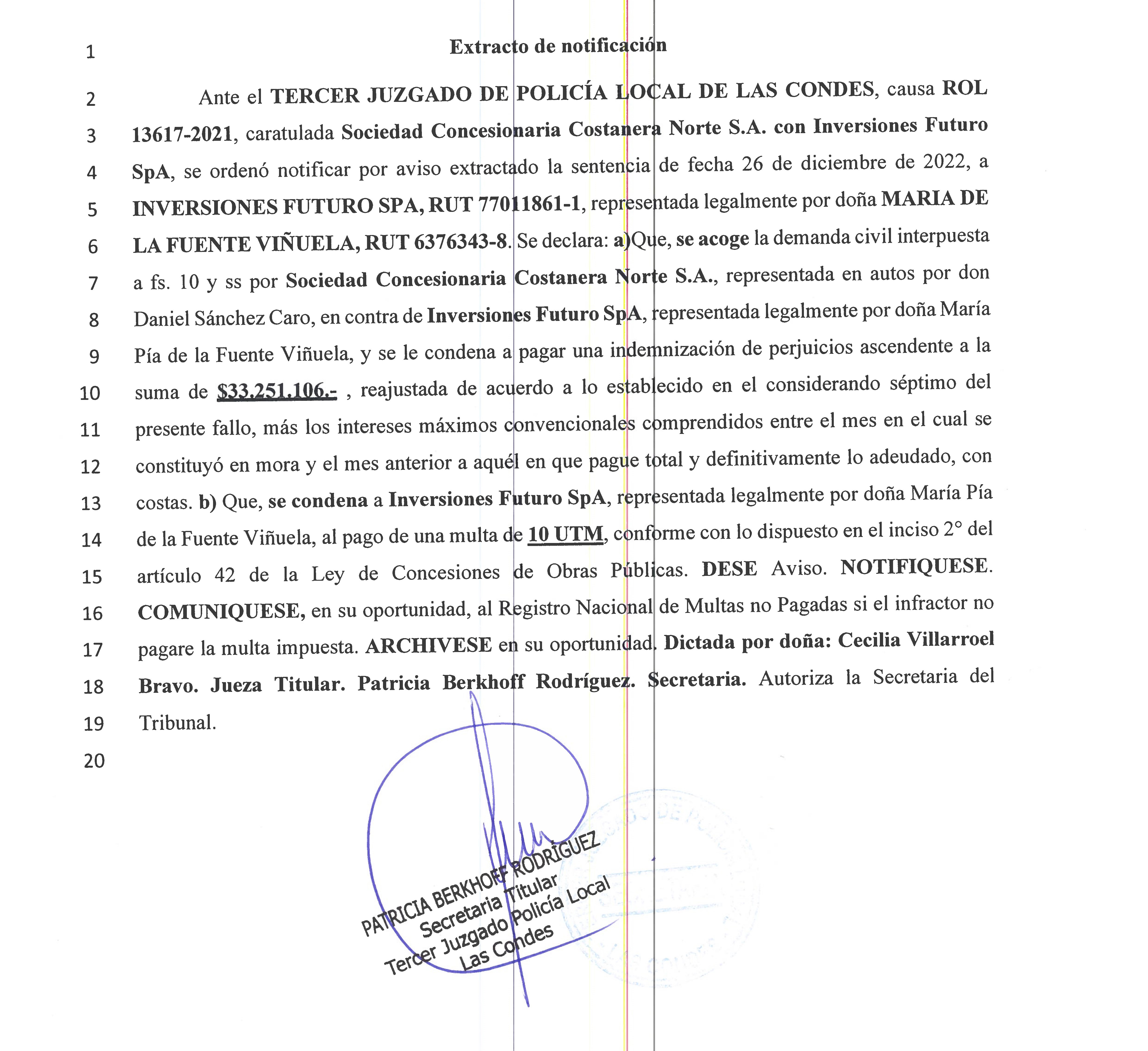 EXTRACTO NOTIFICACIÓN: 3° JUZGADO DE POLICIA LOCAL DE LAS CONDES CAUSA ROL 13617-2021 CARATULADA SOCIEDAD CONCESIONARIA COSTANERA NORTE S.A. CON INVERSIONES FUTURO SPA SE ORDENÓ NOTIFICAR LA SENTENCIA.