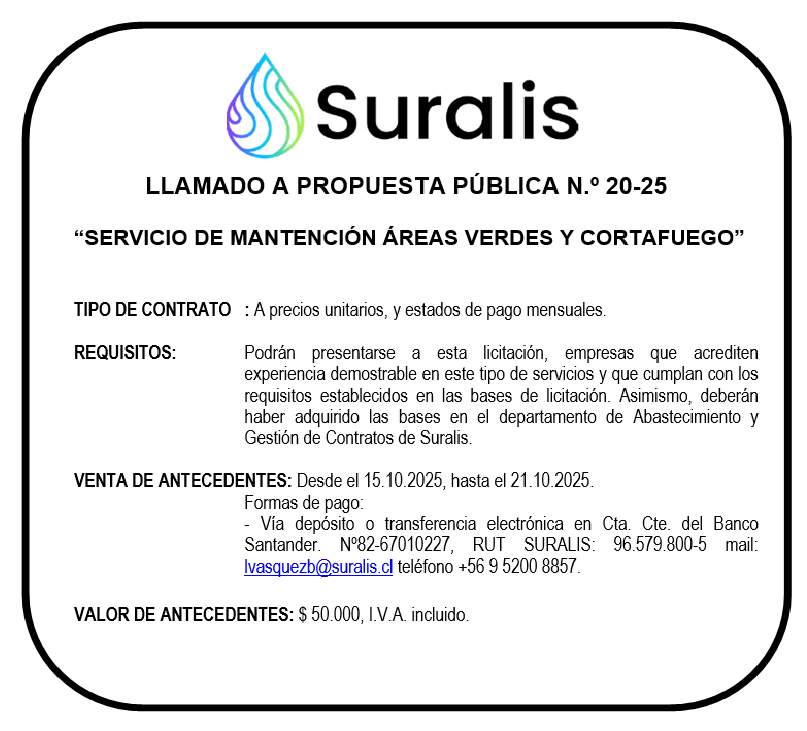 SURALIS: LICITACIÓN PÚBLICA 20-25 "SERVICIO DE MANTENCIÓN ÁREAS VERDES Y CORTAFUEGO”