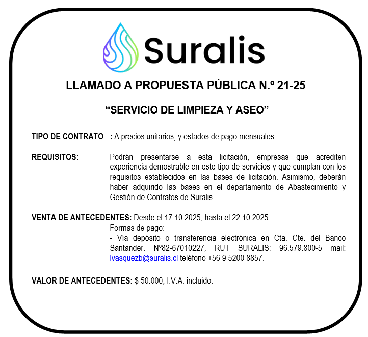 SURALIS: Licitación Pública 21-25 "Servicio de Aseo”.