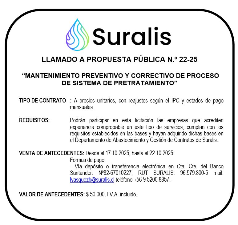 SURALIS: Licitación Pública 22-25 "Mantenimiento Preventivo y Correctivo de Proceso de Pretratamiento.