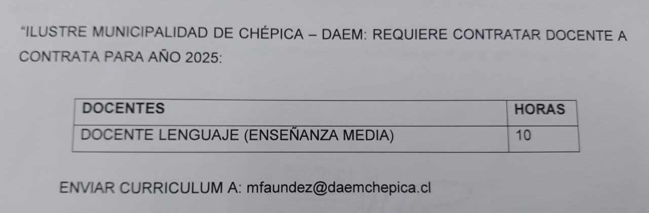 ILUSTRE MUNICIPALIDAD DE CHÉPICA – DAEM: REQUIERE CONTRATAR DOCENTES A CONTRATA PARA AÑO 2025.