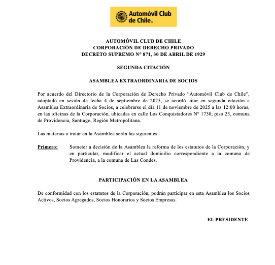 AUTOMÓVIL CLUB DE CHILE: SEGUNDA CITACIÓN ASAMBLEA EXTRAORDINARIA DE SOCIOS