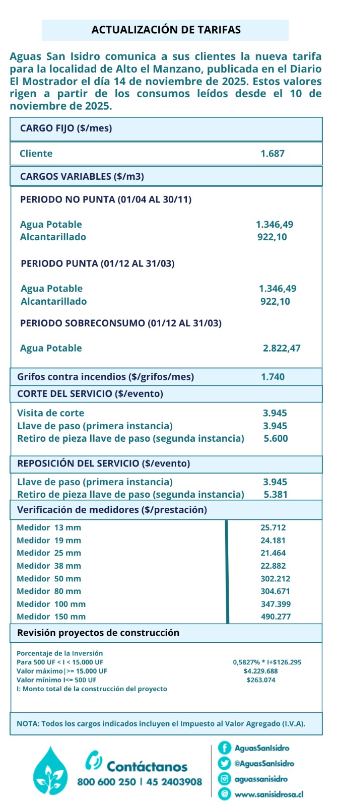 AGUAS SAN ISIDRO S.A.: TARIFAS DE AGUA POTABLE Y ALCANTARILLADO PARA LA LOCALIDAD DE ALTO EL MANZANO QUE RIGEN A LOS CONSUMOS LEÍDOS AL 10 DE NOVIEMBRE DE 2025