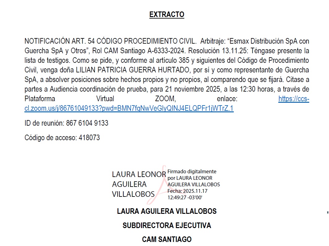 EXTRACTO NOTIFICACIÓN ART. 54 CÓDIGO PROCEDIMIENTO CIVIL. Arbitraje: “Esmax Distribución SpA con Guercha SpA y Otros”, Rol CAM Santiago A-6333-2024. Resolución 13.11.25