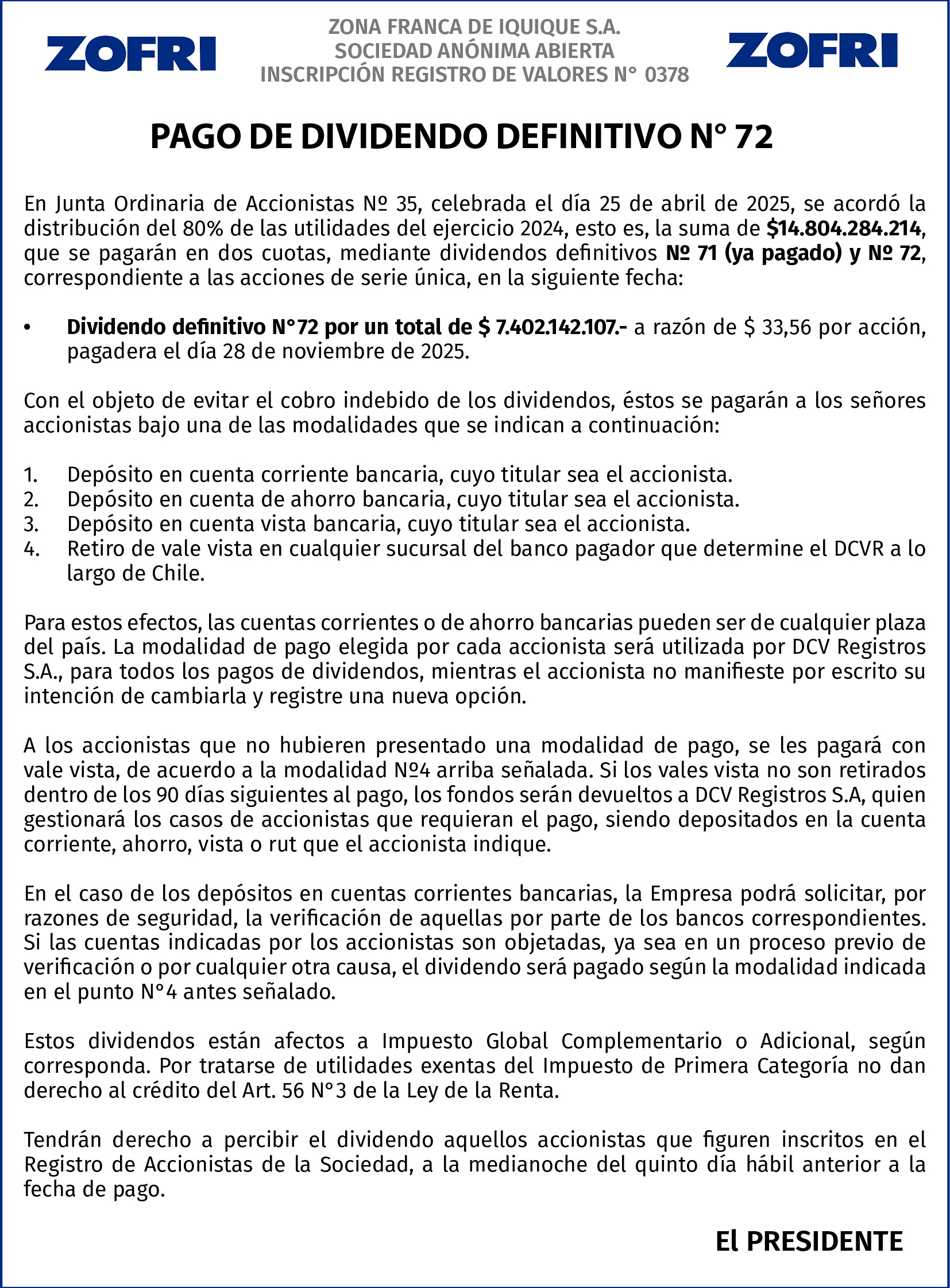 ZOFRI S.A.: AVISO PAGO DE DIVIDENDO DEFINITIVO N°72