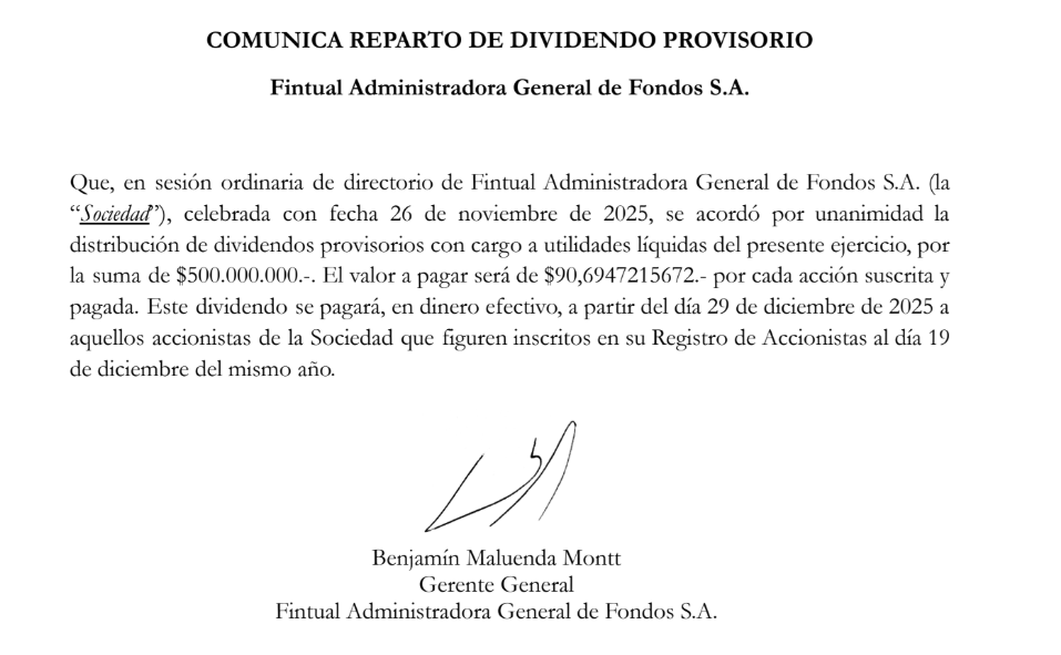 FINTUAL ADMINISTRADORA GENERAL DE FONDOS S.A.: Comunica Reparto De Dividendo Provisorio