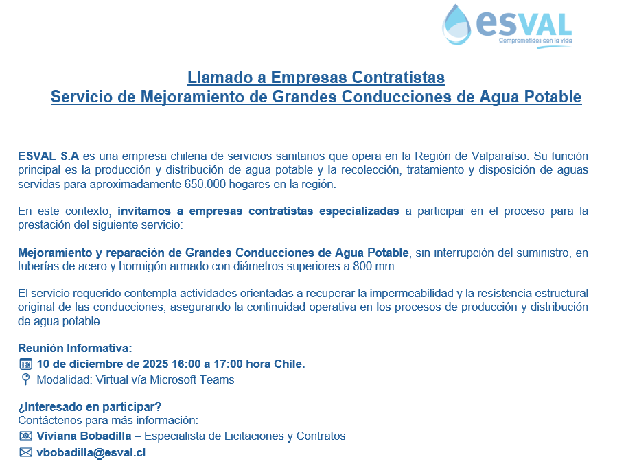 ESVAL S.A.: Llamado a Empresas Contratistas Servicio de Mejoramiento de Grandes Conducciones de Agua Potable