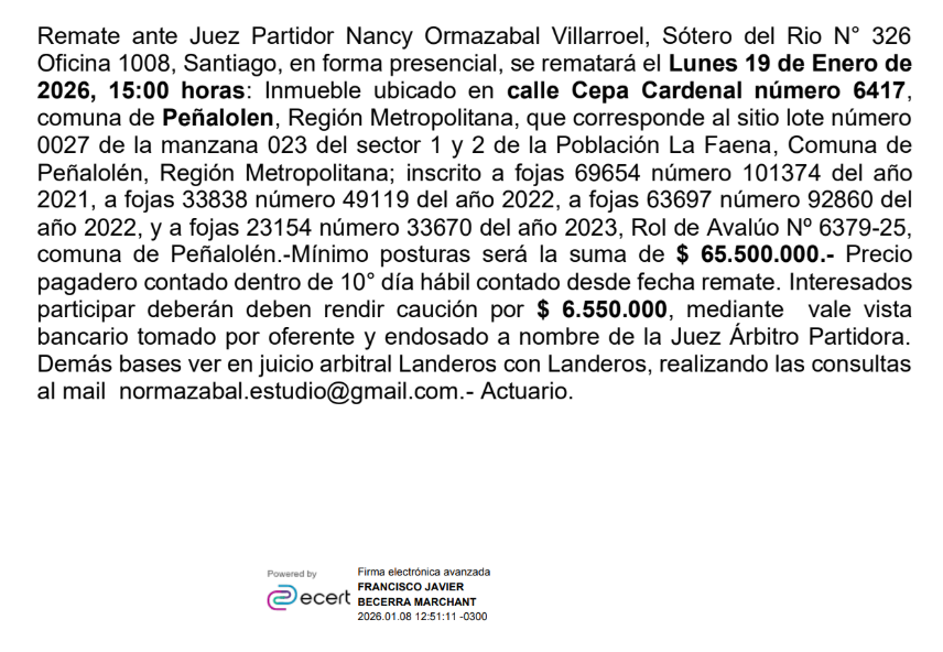 Remate ante Juez Partidor Nancy Ormazabal Villarroel, Sótero del Rio N° 326 Oficina 1008, Santiago, en forma presencial Inmueble ubicado en calle Cepa Cardenal número 6417,comuna de Peñalolen, Región Metropolitana