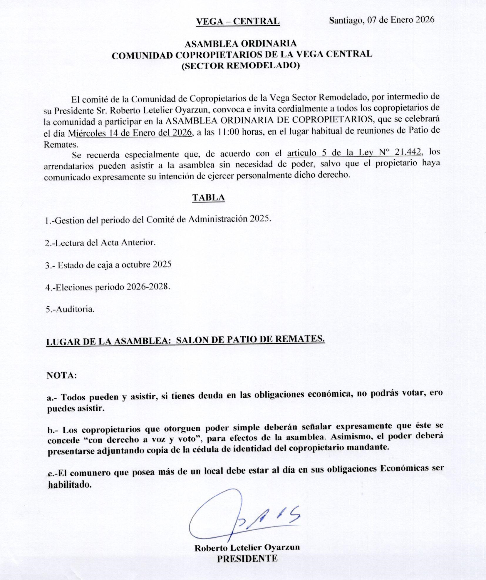 VEGA - CENTRAL ASAMBLEA ORDINARIA COMUNIDAD COPROPIETARIOS DE LA VEGA (SECTOR REMODELADO)
