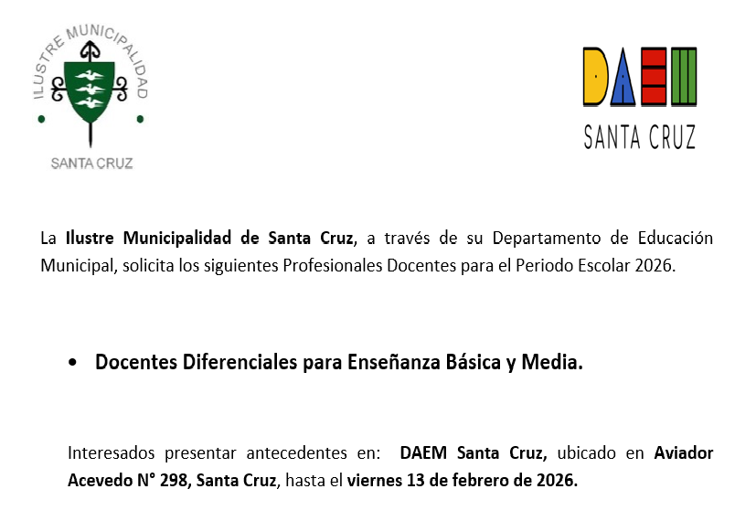 La Ilustre Municipalidad de Santa Cruz, a través de su Departamento de Educación Municipal, solicita los siguientes Profesionales Docentes para el Periodo Escolar 2026.