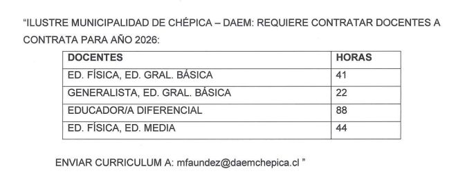 ILUSTRE MUNICIPALIDAD DE CHÉPICA – DAEM: REQUIERE CONTRATAR DOCENTES A CONTRATA PARA AÑO 2026.