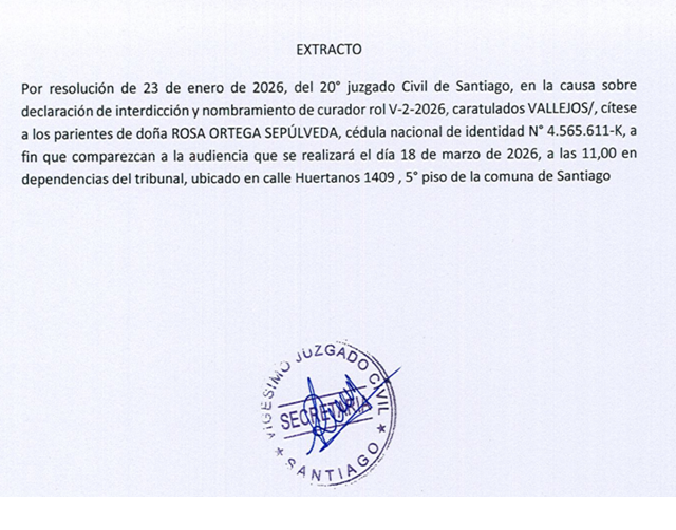 EXTRACTO 20ºJUZGADO CIVIL DE SANTIAGO ROL V-2-2026 CARATULADOS VALLEJOS/
