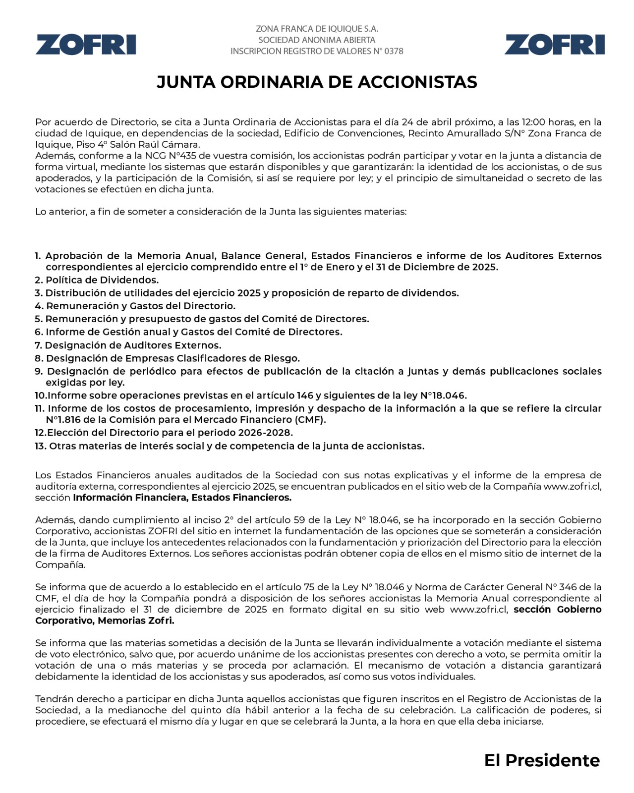 ZOFRI S.A.: CITACIÓN A JUNTA ORDINARIA DE ACCIONISTAS
