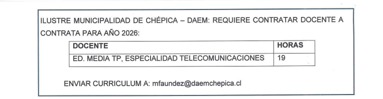 ILUSTRE MUNICIPALIDAD DE CHÉPICA – DAEM: REQUIERE CONTRATAR DOCENTES A CONTRATA PARA AÑO 2026.