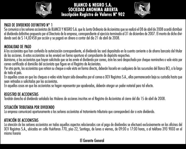 Blanco y Negro S.A.: Pago de Dividendo definitivo N°1