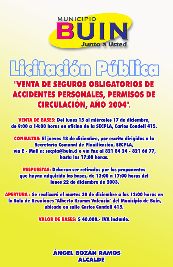 Municipalidad de Buin: Licitación Pública Venta Seguros Obligatorios